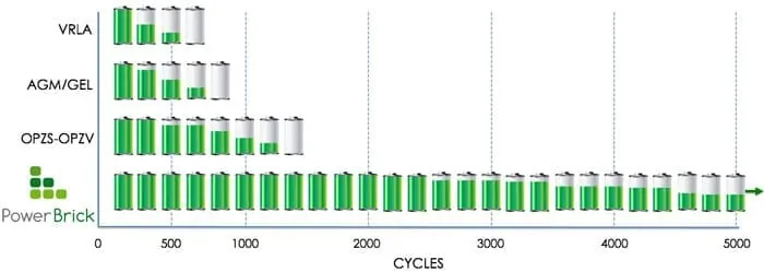 Les batteries PowerBrick+ peuvent être déchargées ou rechargées partiellement, contrairement aux batteries au Plomb qui doivent être totalement rechargées immédiatement après utilisation.